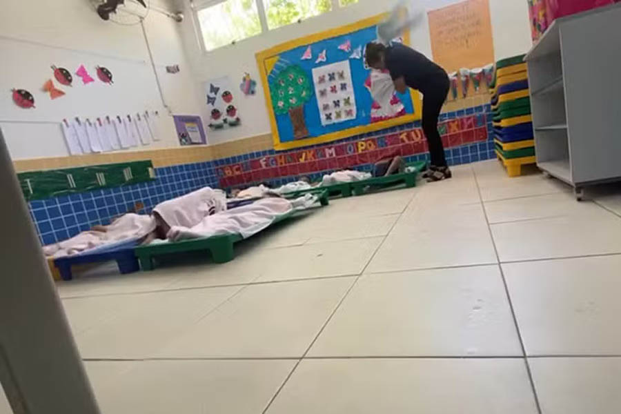 Uma professora da rede municipal de Cabo Frio, na Região dos Lagos do Rio, foi presa em flagrante por maus-tratos contra crianças de 3 e 4 anos dentro da sala de aula. Imagens gravadas por funcionárias da creche mostram a educadora gritando com os alunos, puxando o cabelo de uma criança e atingindo outra com o que parece ser um cobertor, durante o horário de descanso.
