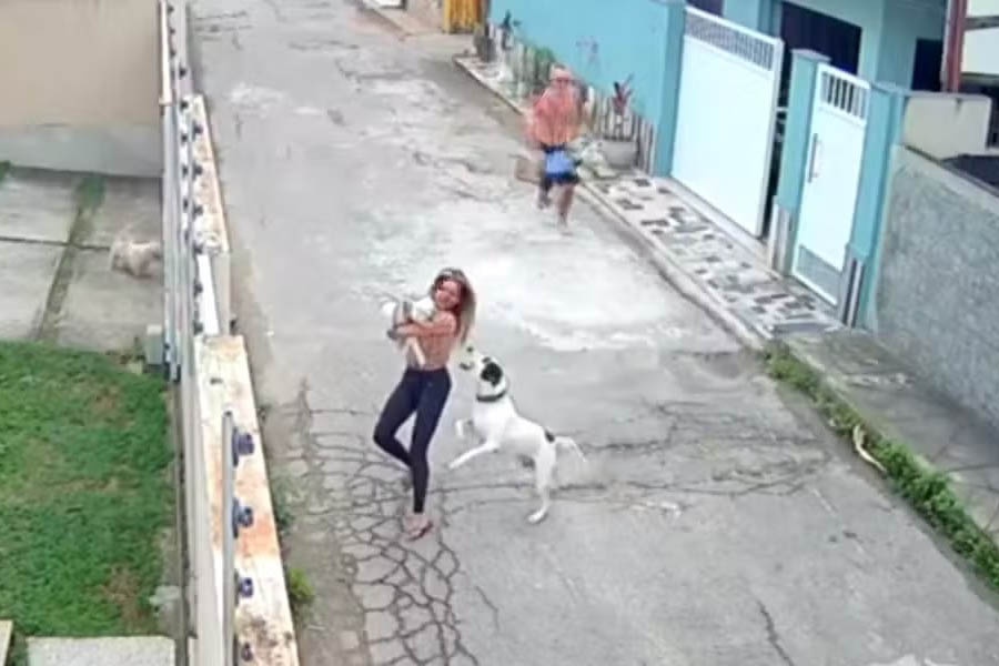 O caso aconteceu na manhã de terça-feira (14) e foi registrado pela câmera de segurança de uma casa vizinha. As imagens mostram o momento em que o cão sai de um portão aberto e parte em direção à vítima.