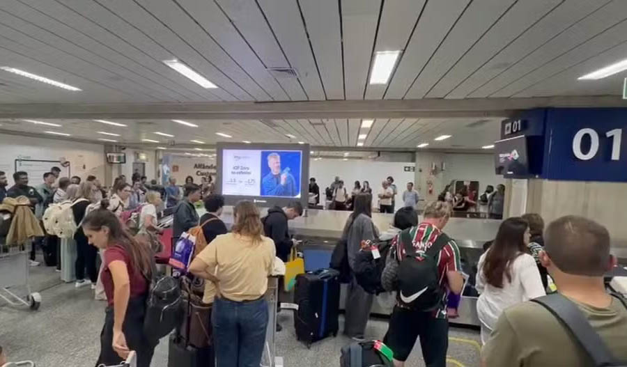 No Aeroporto Internacional do Rio, passageiros enfrentaram demora para retomar as bagagens após o retorno do voo.